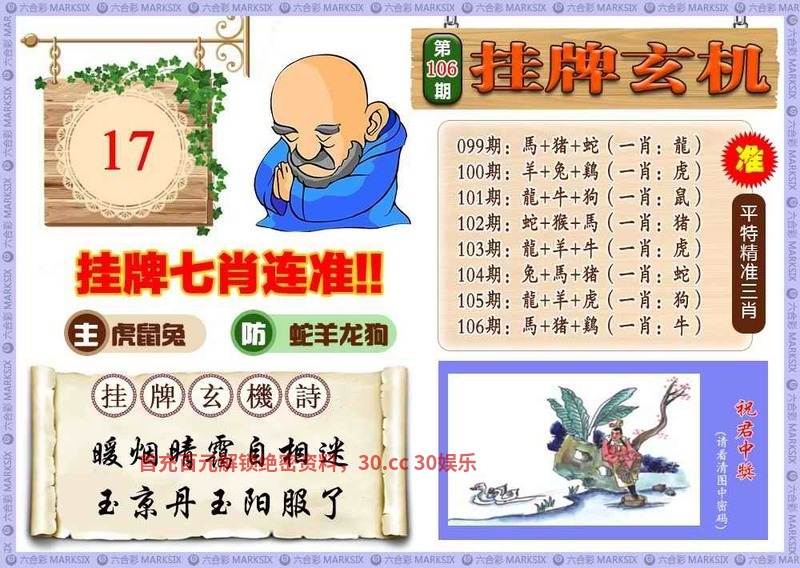 106期:⑦肖 | 鸡猴鼠龙猪兔马 | 开:猪43中 |
